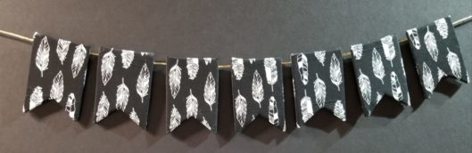 Light weight decor. Fabric covered (Black with White Feathers) pendants on jute strand. Pendants are approximately 4in X 3in. 7 pendants (23 inches) totaling 73 inches.