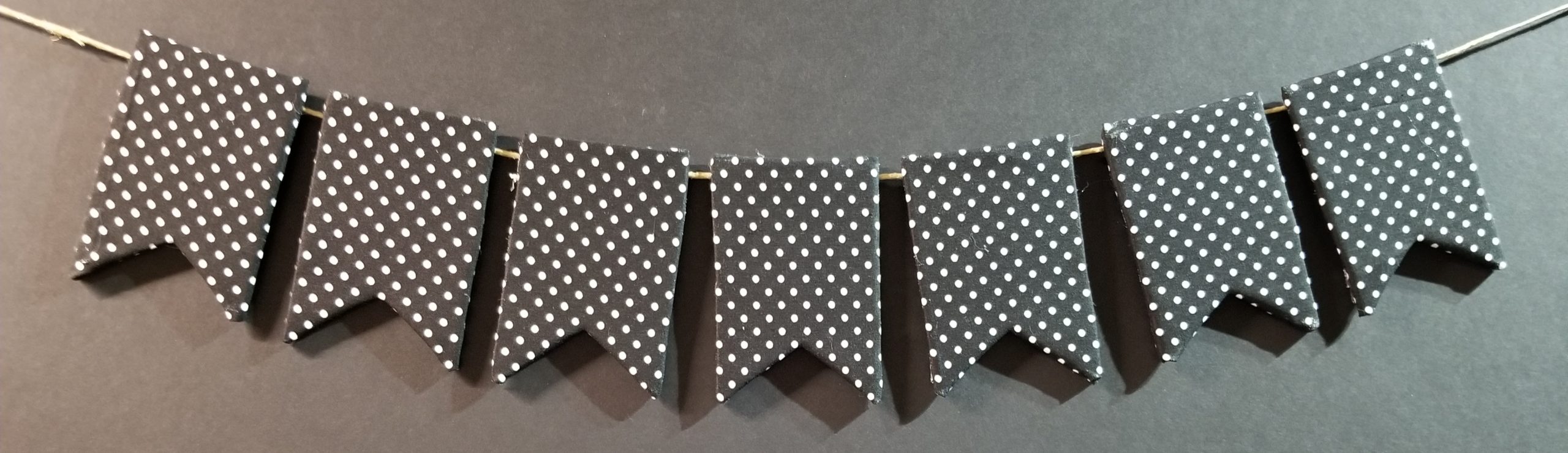 Light weight decor. Fabric covered (Black with White Polka dots ) pendants on jute strand. Pendants are approximately 4in X 3in. 7 pendants (22 inches) total length 64 inches.