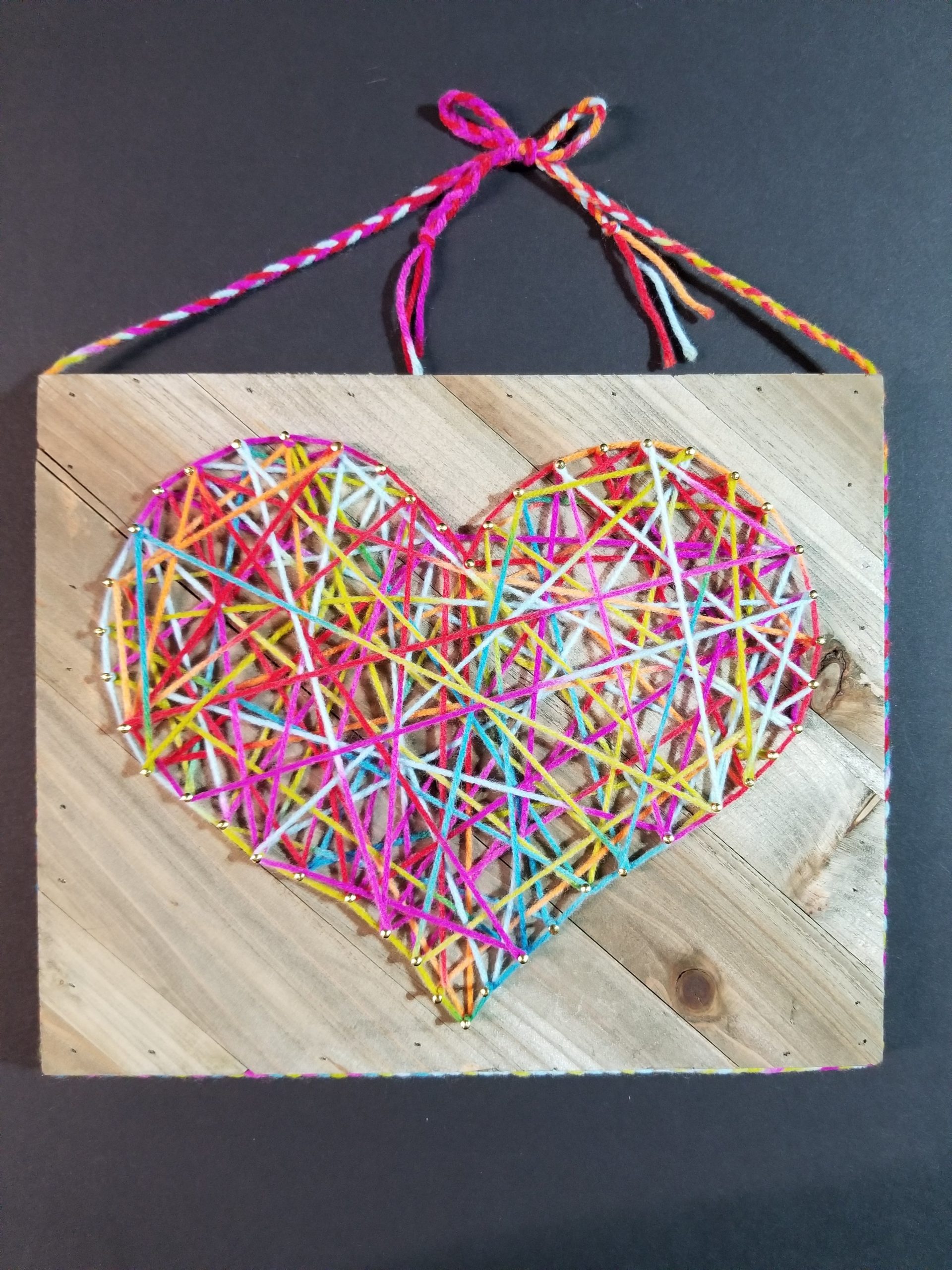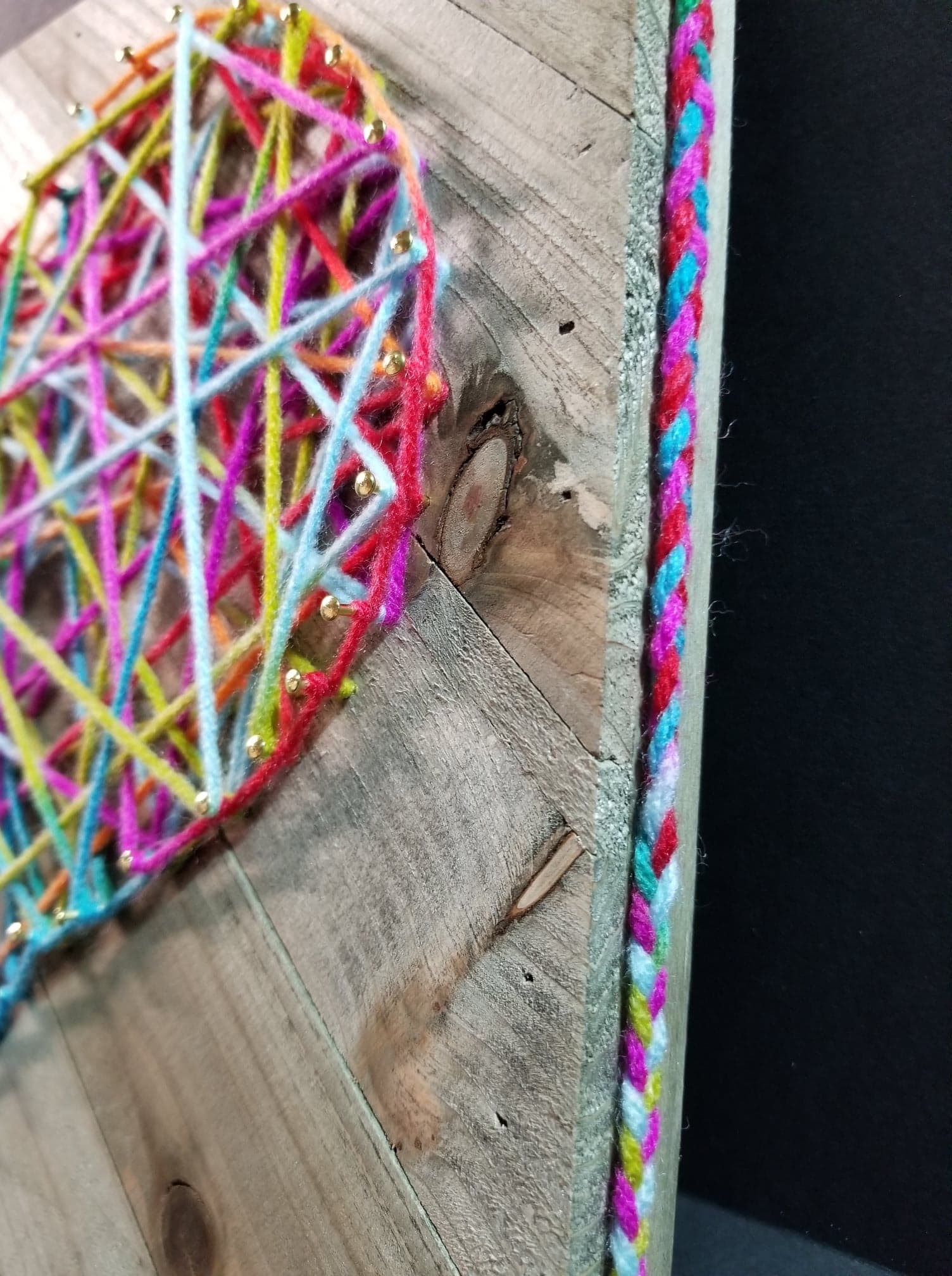 Multi-Colored Yarn with gold nails on aged wooden plaque. 10inches X 12inches. Braided yarn hanging strand stretches 4.5 inches above the plaque.