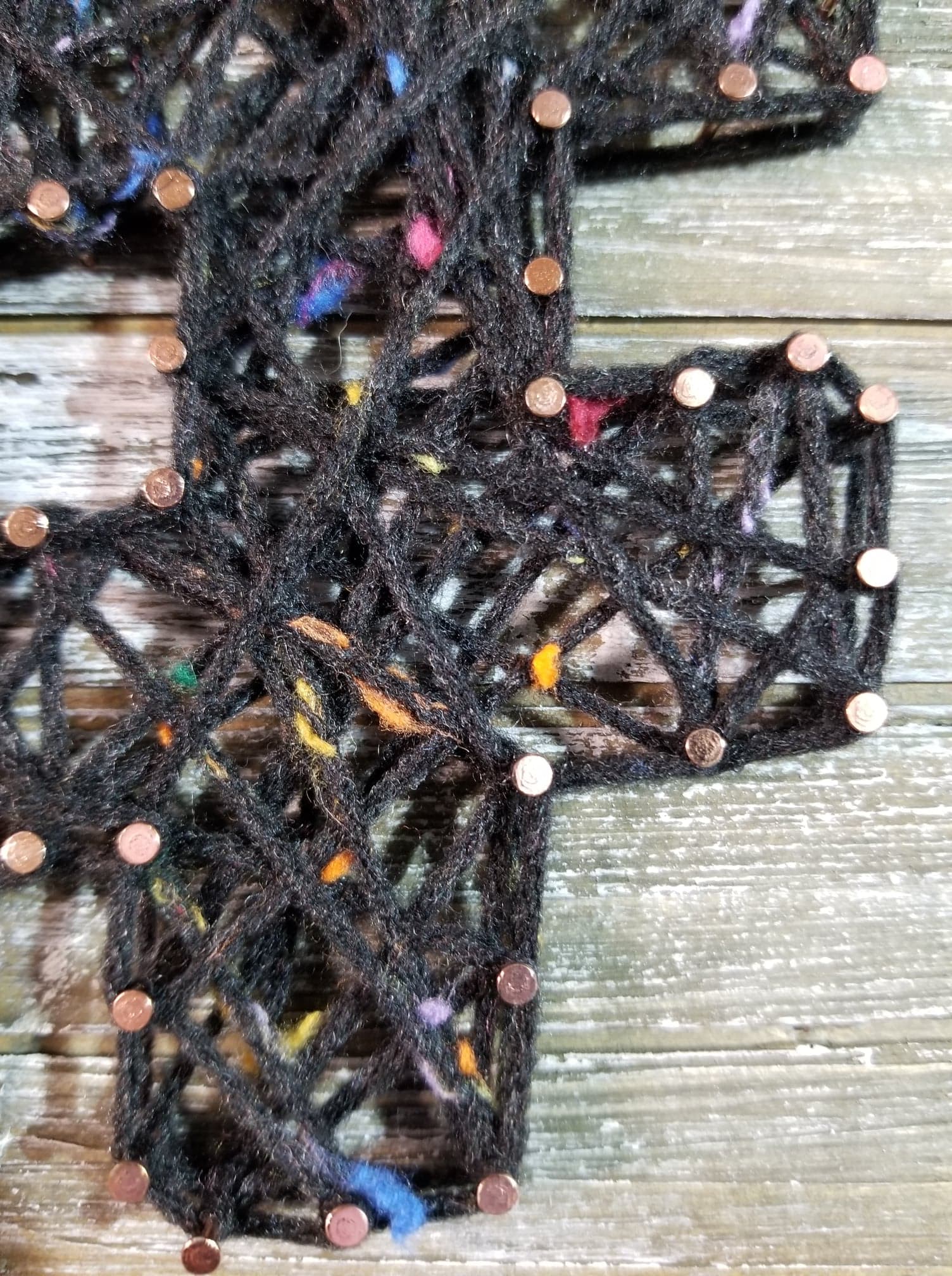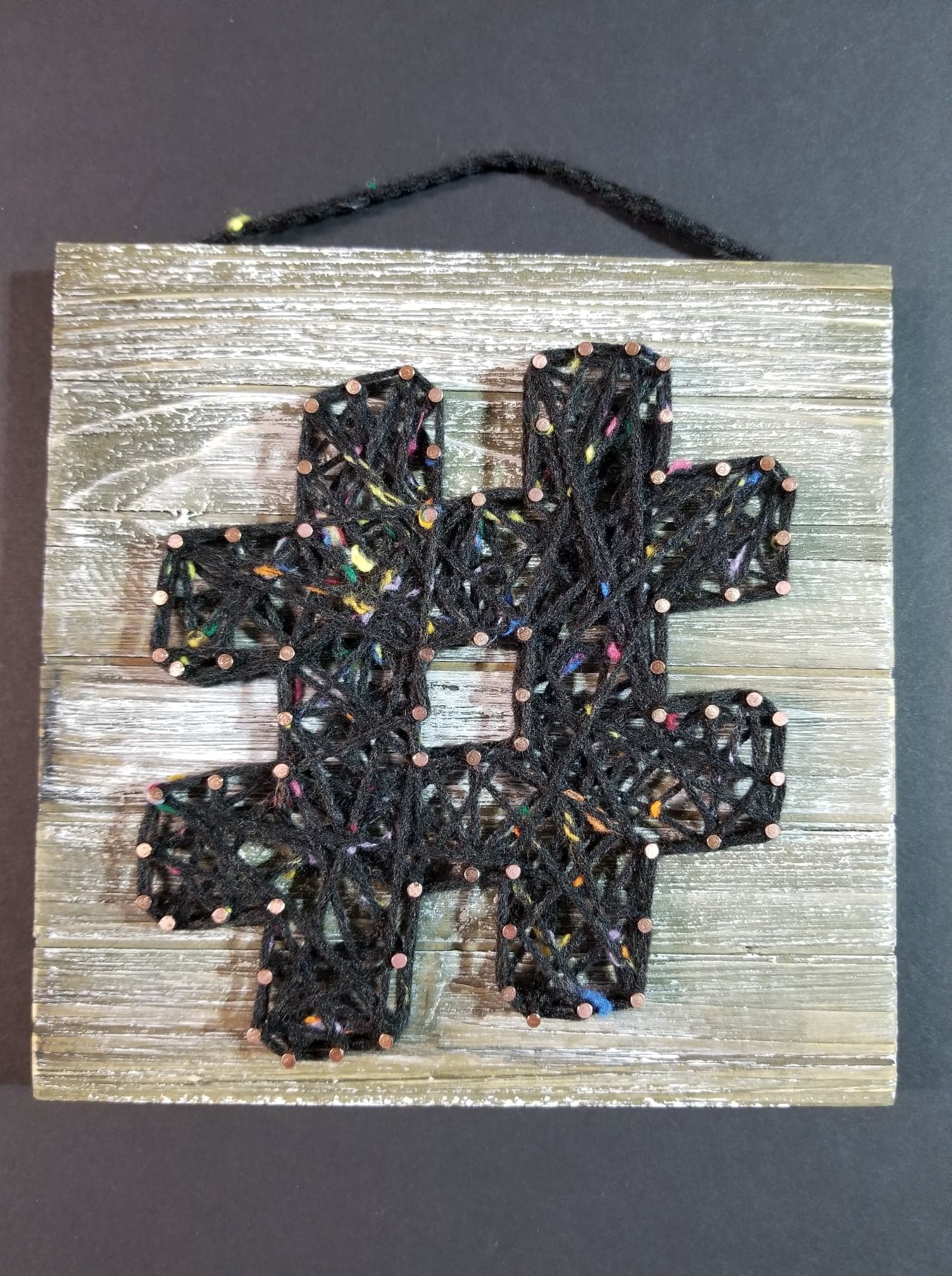 Black yarn (with multi colored detail) with rosey tinted nails on a white washed wooden plaque 8 inch X 8 inch. Braided yarn hanging strand stretches 1.75 inches above the plaque.
